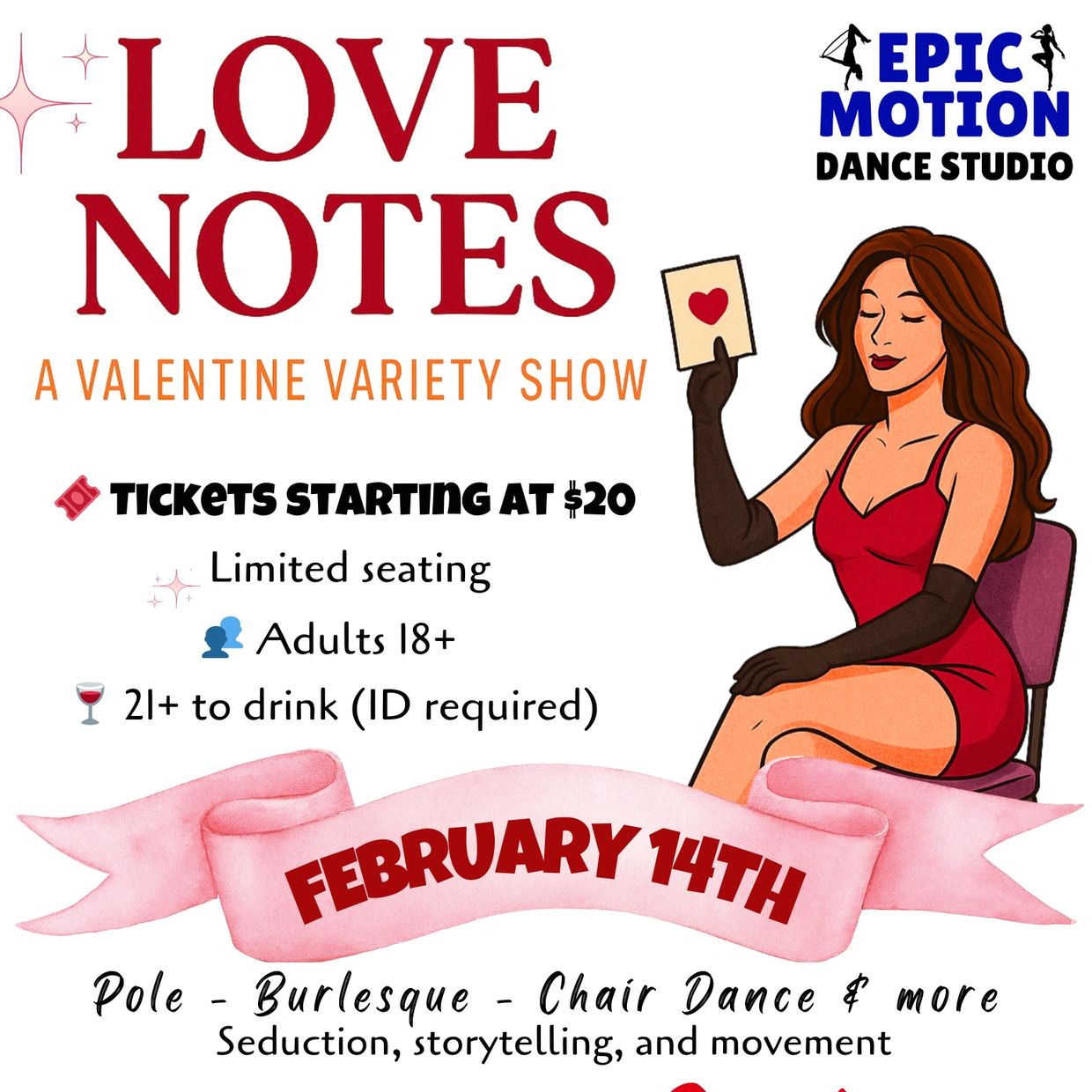 Love Notes is a Valentine’s Day–inspired variety show presented by Epic Motion Dance Studio, blending dance, movement, and expressive performance in an intimate, talk-show–style setting.